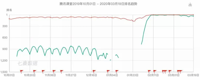 此外,疫情期間,騰訊還有一匹黑馬——騰訊課堂,這個(gè)推出多年的APP在AppStore之前一直徘徊在1000名左右,疫情爆發(fā)后迅速躥高,最高到達(dá)了第5名的高位。