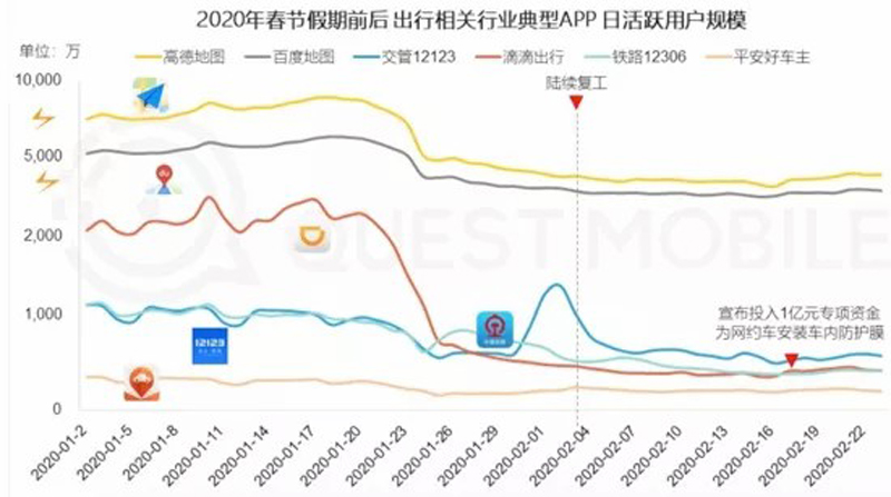 根據(jù)Questmobile數(shù)據(jù),滴滴日活用戶(hù)從疫情之前的超2000萬(wàn)下降到不足500萬(wàn)——同樣下降的還有高德、百度等地圖應(yīng)用。